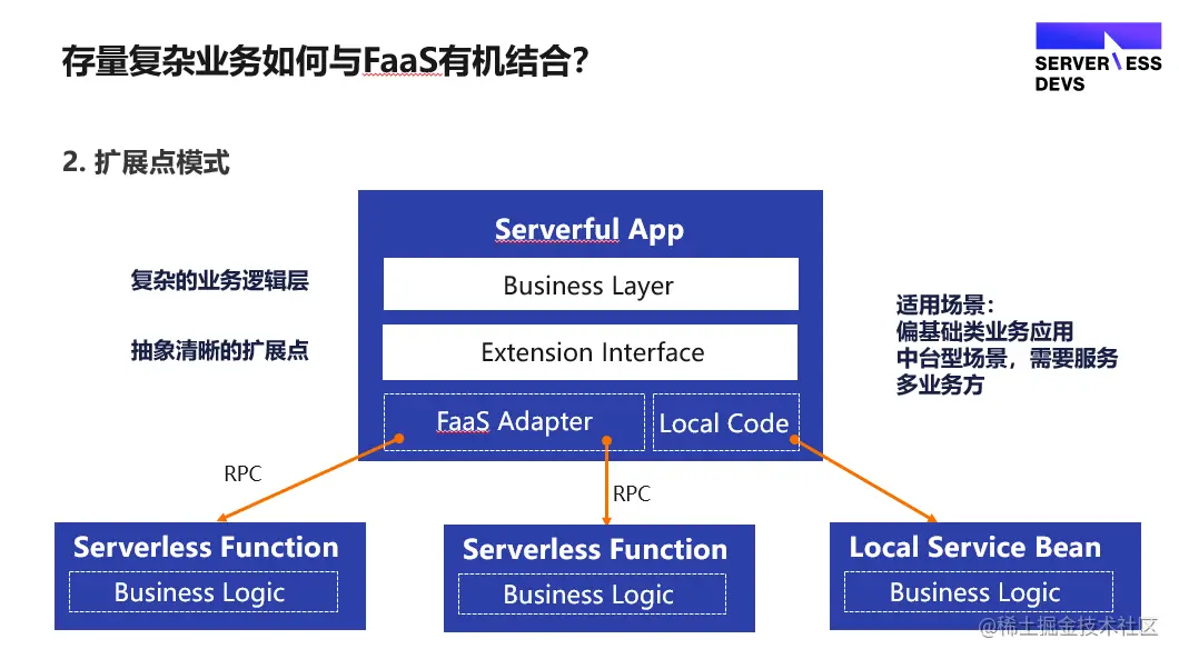 这样对于一些后续增量的业务逻辑,就可以使用 FaaS 的能力来提供,而对于存量的业务逻辑,则可以基本保持不变,只需要在代码结构上稍作适配,也可以成为标准的扩展点实现。