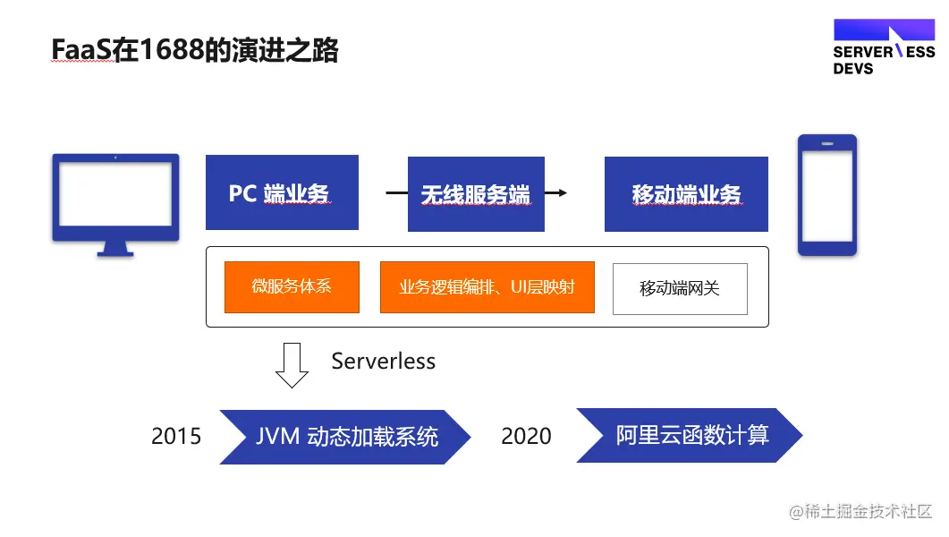 1688 对 FaaS (Function as a Serverles) 技术的探索要追溯到 2015 年左右。当时整个阿里集团最大的业务目标就是 “ALL IN 无线”,移动互联网刚刚兴起,需要快速地把存在 PC 端的业务,无论是淘宝也好;还是 1688,需要能够迅速地把它移植到移动端上面,生成 App 来抢占移动端流量。