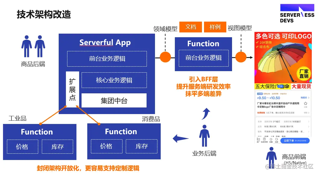 首先回答第一个问题,在存量复杂业务和 FaaS 能力结合这件事上,通过实践探索,我们总结出了两种比较落地的模式,分别是 BFF 模式和扩展点模式。