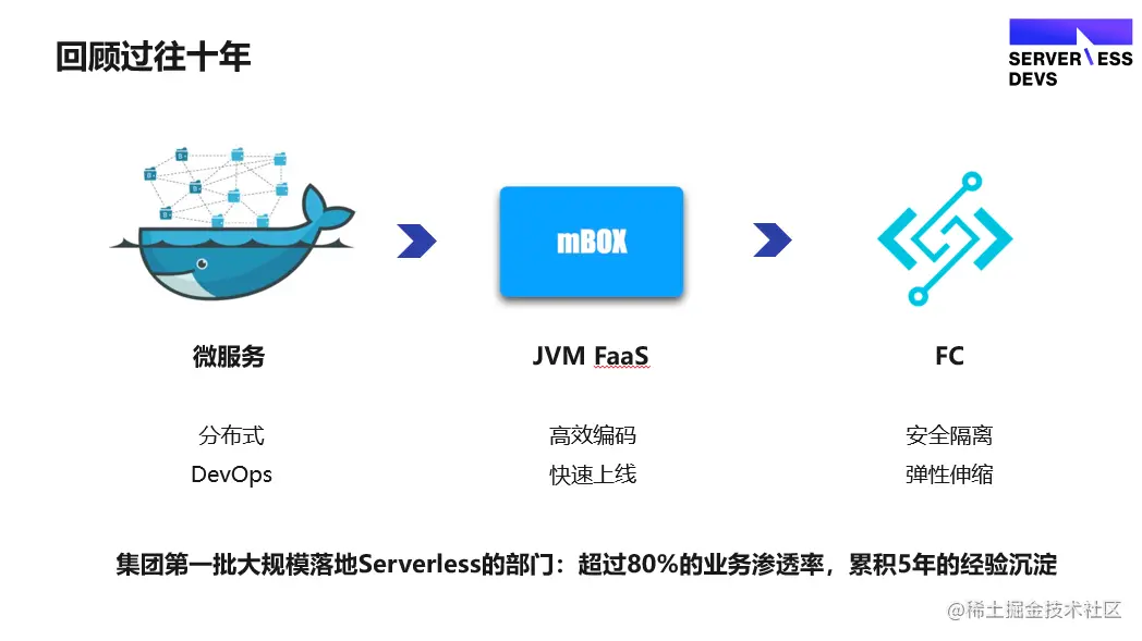 回顾 CBU 的 Serverless 演进之路,从最早的微服务架构,到自主研发的 JVM FaaS 系统,再到现在的 FC 函数计算,逐步探索出了最适合业务场景的技术方案,同时也算是在业界率先迈出了大规模落地 FaaS 的一步:作为集团第一批大规模落地 Serverless 理念的部门,我们的 FaaS 系统在部门内拥有超过 80% 的业务渗透率,使用时间更是达到了 5 年以上。
