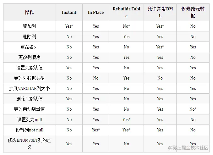 关于列的 DDL 操作,是否支持 instant 等算法,官方文档给出了一个表格,现整理如下,星号表示不是全部支持,有依赖项。
