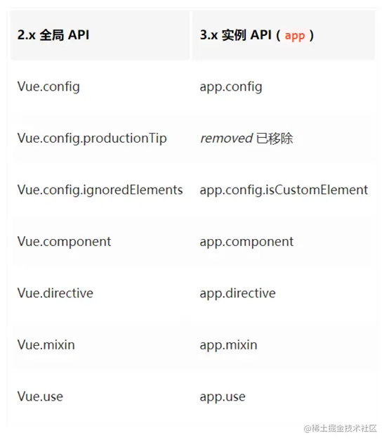 应用程序实例暴露当前全局 API 的子集,经验法则是,任何全局改变 Vue 行为的 API 现在都会移动到应用实例上app上,以下是当前全局 API 及其相应实例 API 的表: