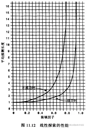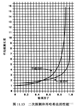 二次探测和再哈希法性能相当,它们的性能比线性探测略好。由下图可知,随着装填因子的变大,平均探测长度呈指数形式增长,需要探测的次数也呈指数形式增长,性能不高。