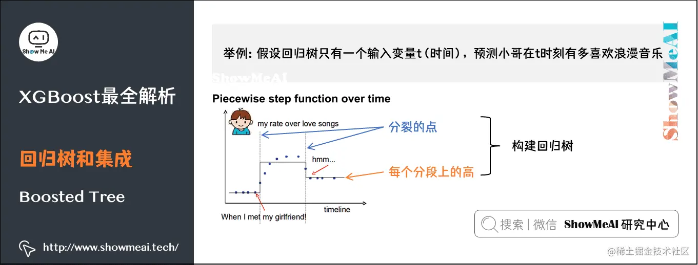 举例:假设回归树只有一个输入变量t(时间),希望预测小哥在t时刻有多喜欢浪漫音乐。