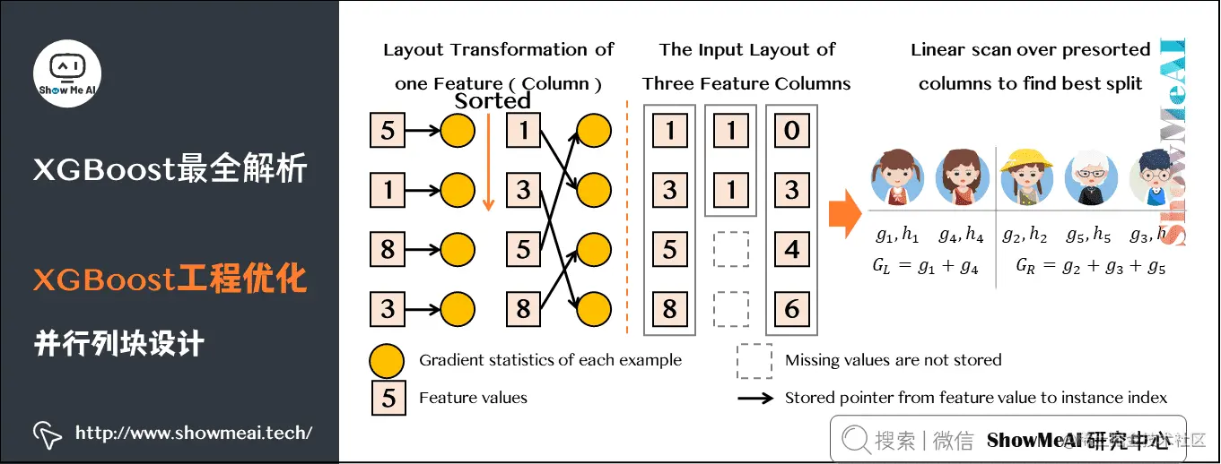XGBoost将每一列特征提前进行排序,以块(Block)的形式储存在缓存中,并以索引将特征值和梯度统计量对应起来,每次节点分裂时会重复调用排好序的块。而且不同特征会分布在独立的块中,因此可以进行分布式或多线程的计算。