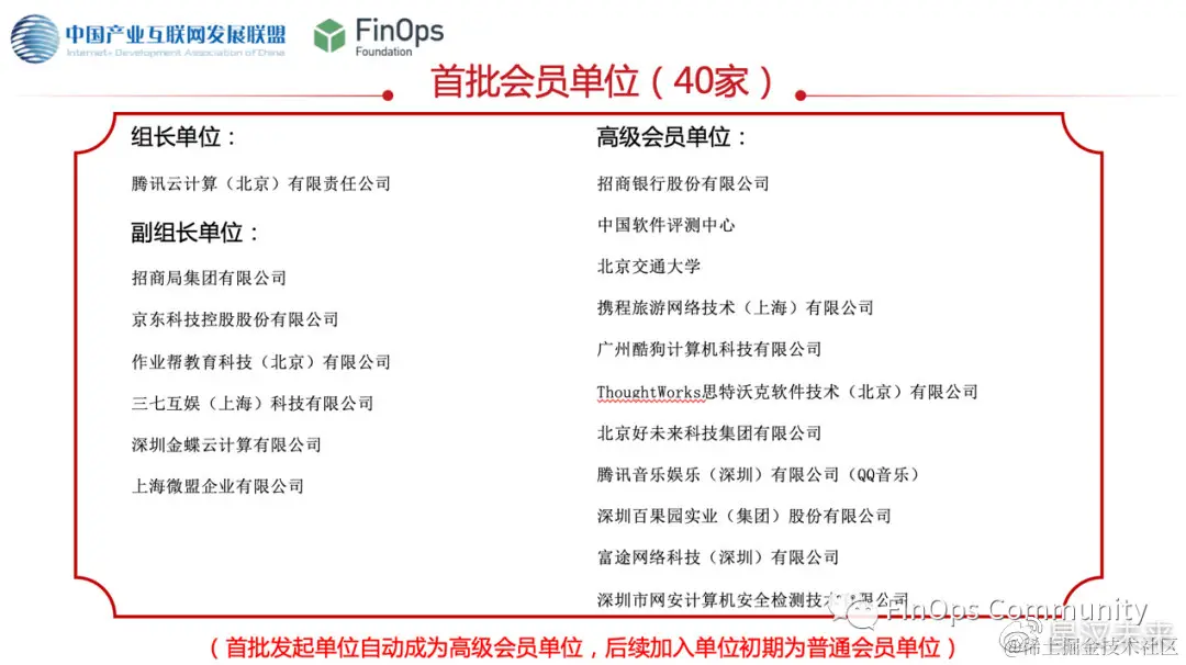 FinOps 产业标准工作组是在中国产业互联网发展联盟指导下,由40家企事业单位联合发起成立,致力于通过研究和制定云财务管理相关标准体系促进企业更加高效合理地采购和使用云服务,降低企业数字化转型过程中的心智负担。