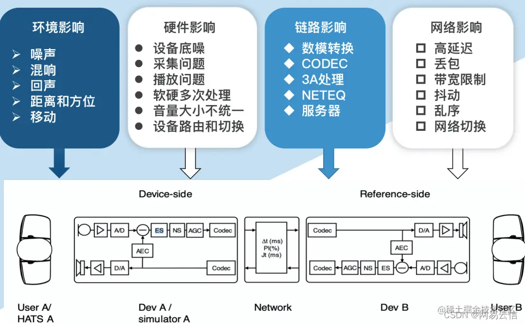 Conversation Quality : 对话音质,除了包含 A/B 两个人的 Listening Quality 和 Talking Quality,还跟双工通话有关系,主要的影响因素有回声双讲和端到端延时。