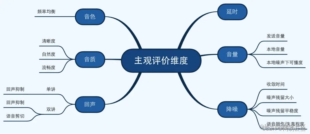 主观测试要关注的点如上图所示,分为音质、音色、音量、延时、回声、降噪等几个大的方面。