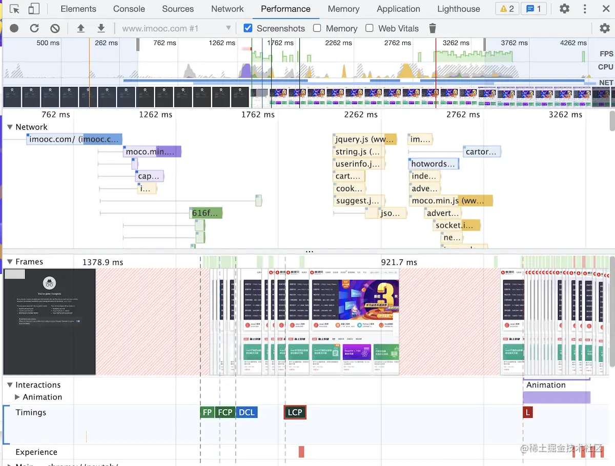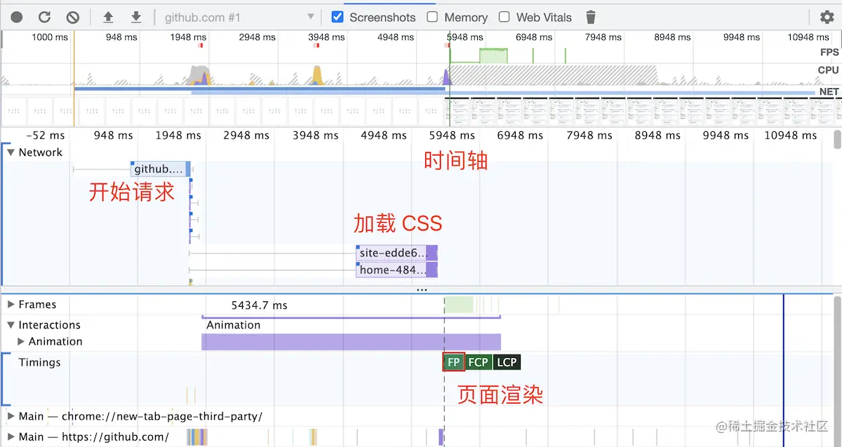 Performance 可以检测到上述的性能指标,并且有网页快照截图