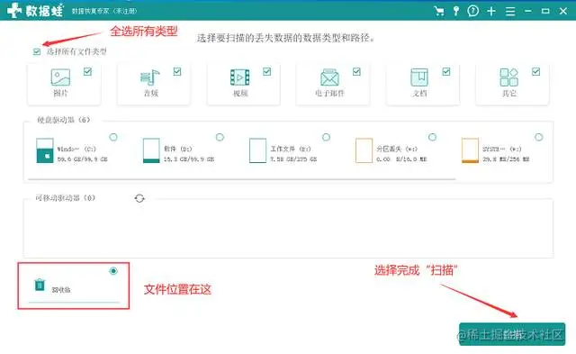 第1步:打开数据蛙数据恢复专家,选择所有的文件类型,多次测试发现全选更为有效,选择好文件类型后,根据丢失文件的实际位置选择文件路径,最后点击“扫描”;