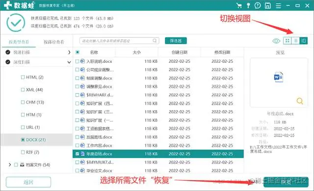 第3步:结果已经全部扫描出来了,你所删除或丢失的文件都会显示出来,左侧即是个各种文件类型,当然可通过上方直接搜索。切换视图查看文件大小等信息,最后选择好文件即可开始“恢复”!