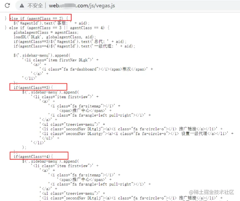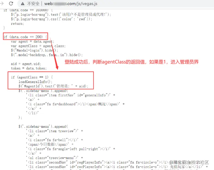 但是继续阅读js代码,发现存在如下的代码:登陆成功后data.code == 200,再根据返回包的agentClass值,可以控制显示的是管理员界面还是客服界面还是一级、二级用户界面。由于是前端判断且通过document.write函数渲染界面,因此可以前端绕过,直接修改返回包中的agentClass值为管理员的值,就可以进入到管理员界面,且后端所有接口也都如上面一样不存在鉴权,因此管理员的后台所有功能都可以使用