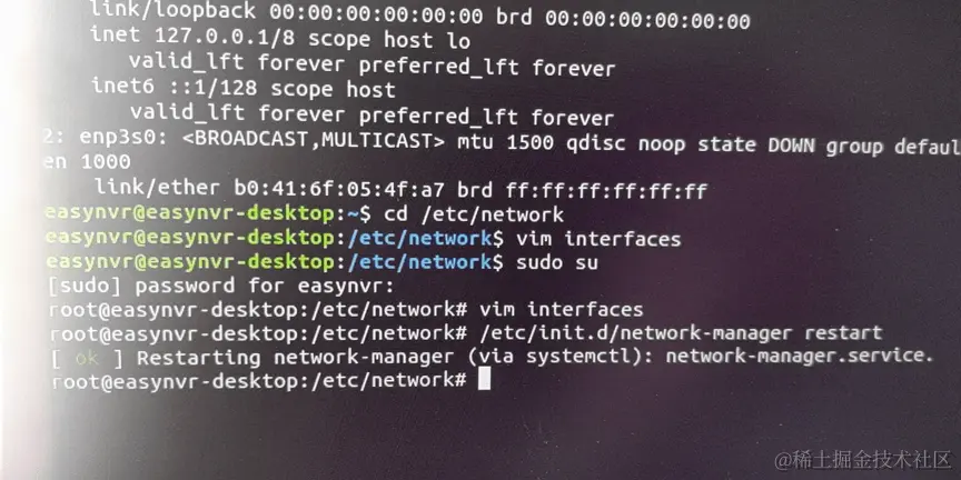 查看到网卡信息之后,如果和下面的图片一样,则要输入: sudo su (这时候会出现输入密码,输入登录密码即可)。