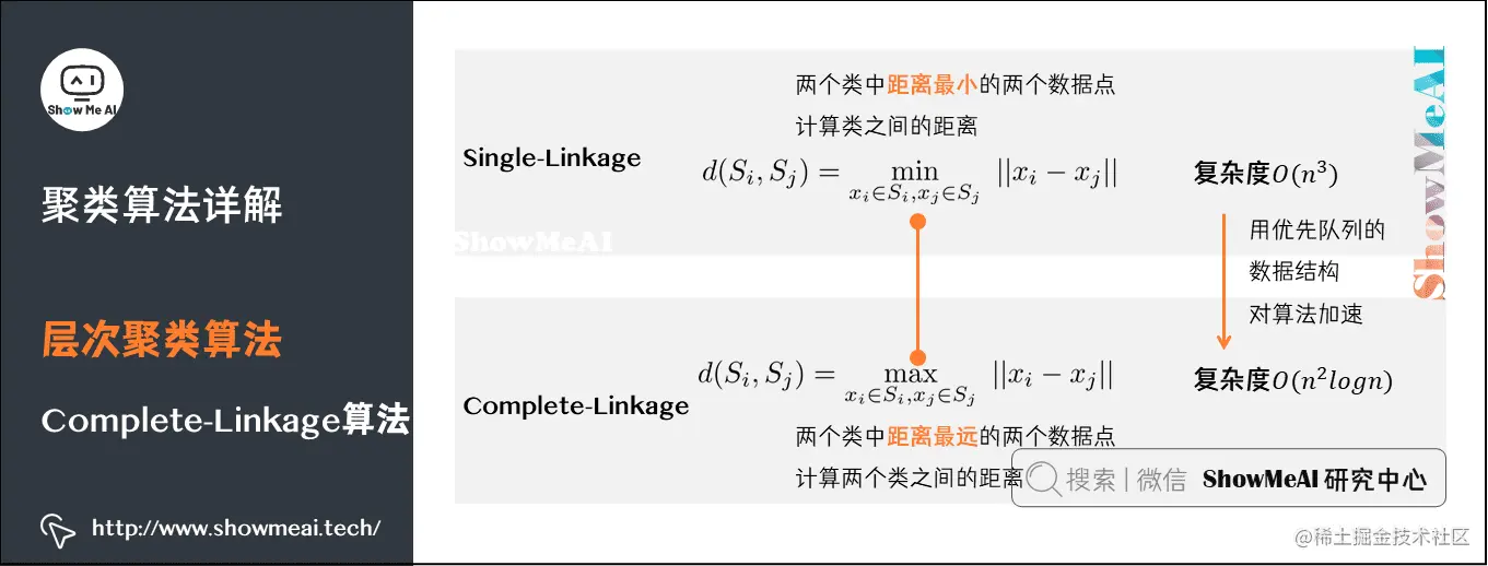 这两种计算方法各有利弊。总的来说,层次聚类的计算复杂度是 级别,算是很高的了。可以用优先队列的数据结构对算法加速,加速后能减低到 的级别。