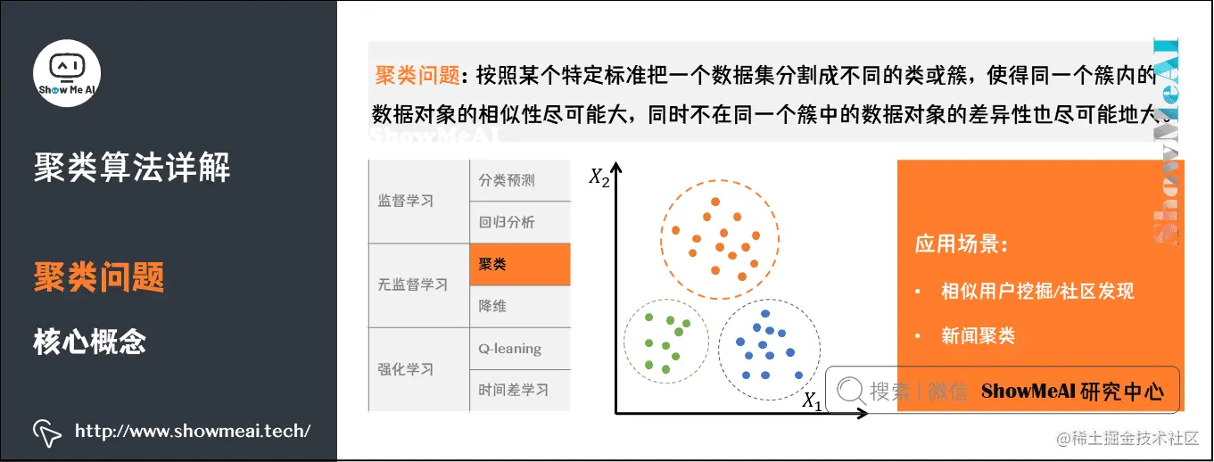 聚类算法在很多场景下都有应用,例如新闻自动分组,用户分群,图像分割等等。很多时候,无监督的聚类算法,得到的聚类结果还可以作为特征在后续监督学习中应用,提升整体效果。本篇内容ShowMeAI带大家一起来学习一下聚类算法。