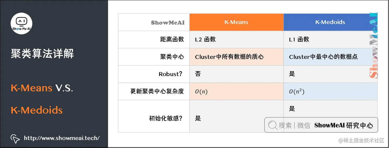 总结来说,K-Medoids算法的迭代过程与K-Means是一致的,不同点如下所示: