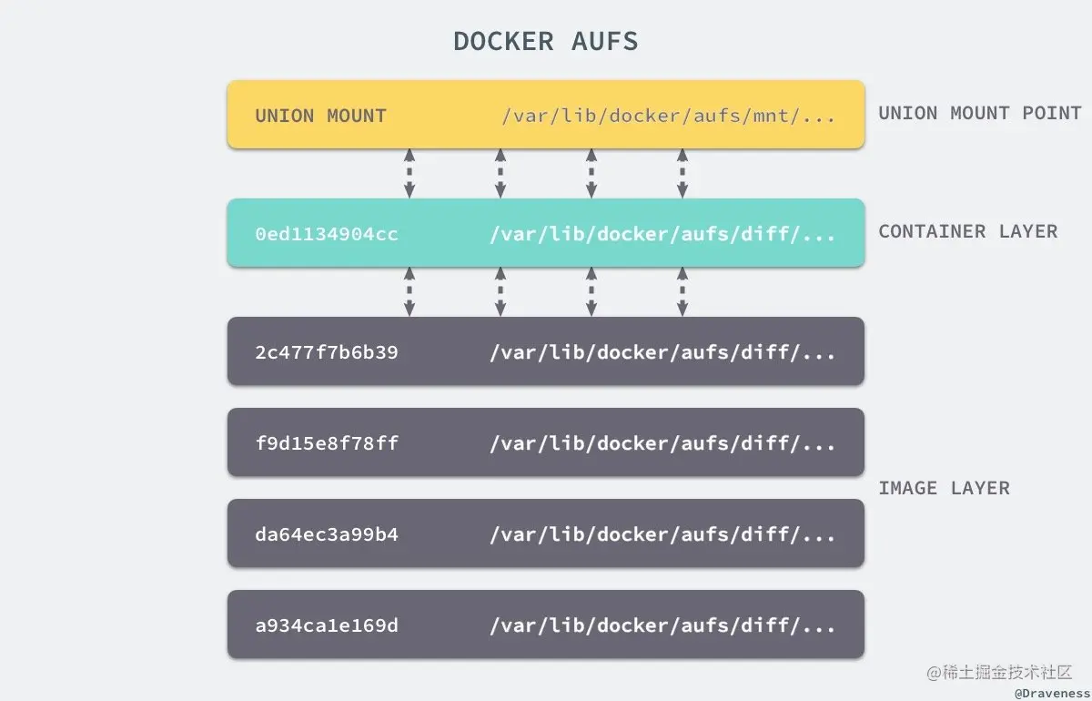 AUFS 作为联合文件系统,它能够将不同文件夹中的层联合(Union)到了同一个文件夹中,这些文件夹在 AUFS 中称作分支,整个『联合』的过程被称为联合挂载(Union Mount):