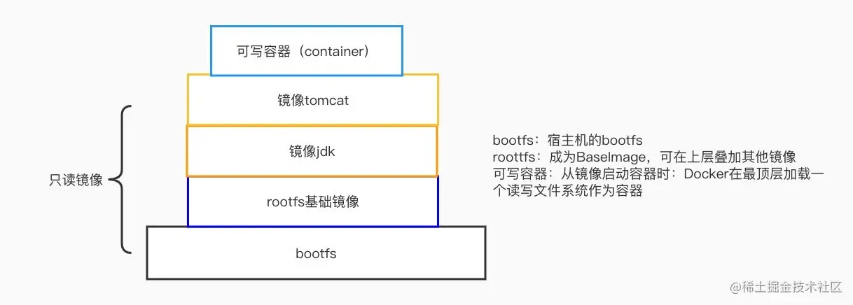 Docker 中的每一个镜像都是由一系列只读的层组成的,Dockerfile 中的每一个命令都会在已有的只读层上创建一个新的层: