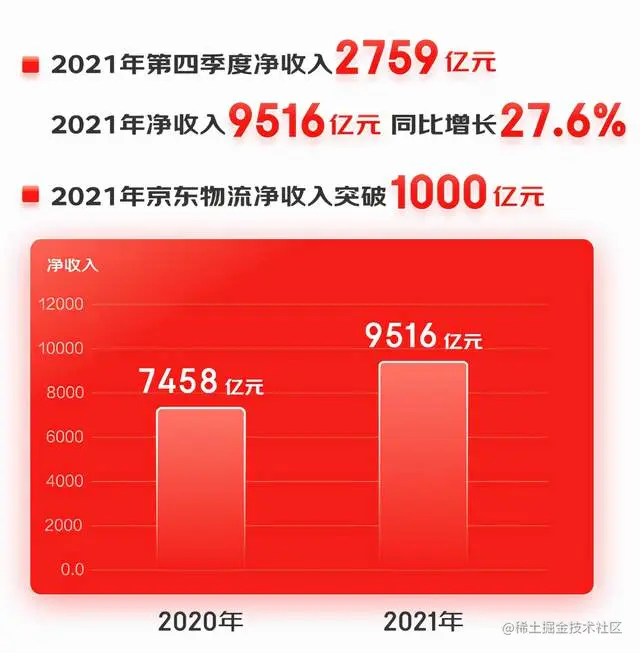 3月10日,京东集团(纳斯达克股票代码:JD,港交所股票代号:9618)发布了2021年第四季度及全年业绩。2021年全年,京东实现净收入9516亿元人民币(约1493亿美元),同比增长27.6%。