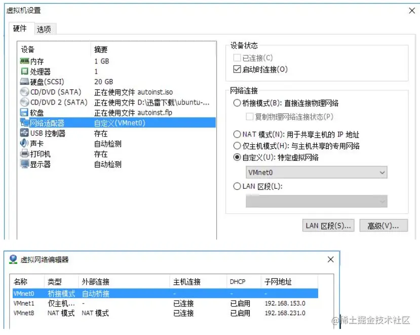 将虚拟机的网络连接模式设置为桥接模式,在试验过程中发现仅在虚拟机设置中将网络适配器设置为桥接模式不能使两个运行的虚拟机处于同一个局域网中。需要将网络适配器设置为自定义,选择特定虚拟网络中的桥接网络。具体有哪些虚拟网络可以在 编辑->虚拟机网络编辑器 中添加、配置、删除。