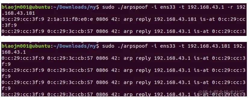 其中的interface可以在Ubuntu中查看网关是看到,本机为ens33,这条命令的意思即为:欺骗主机host自己就是主机target