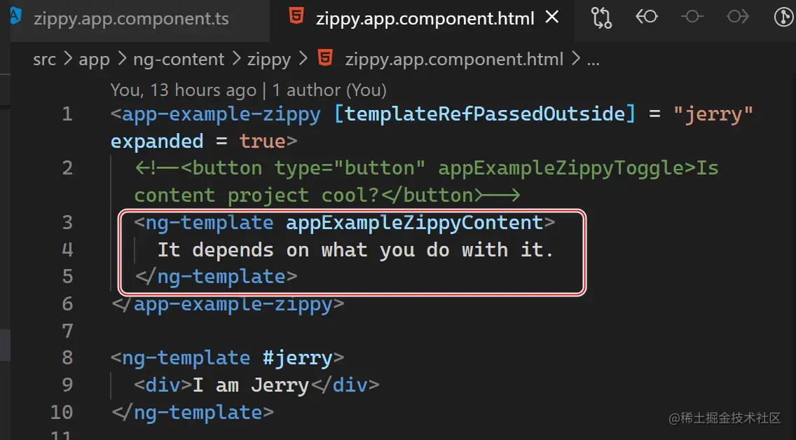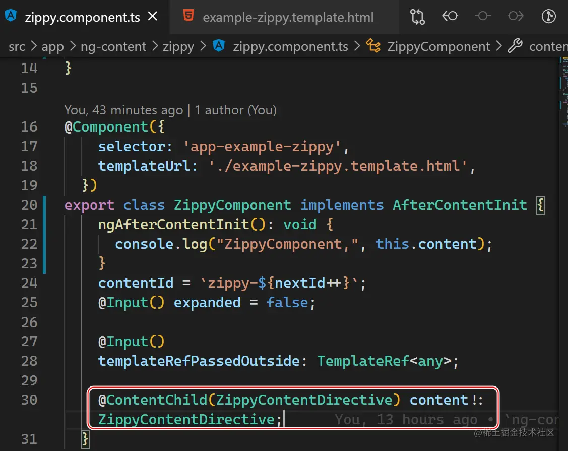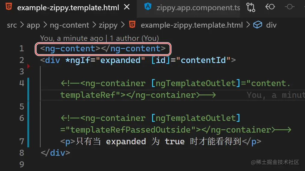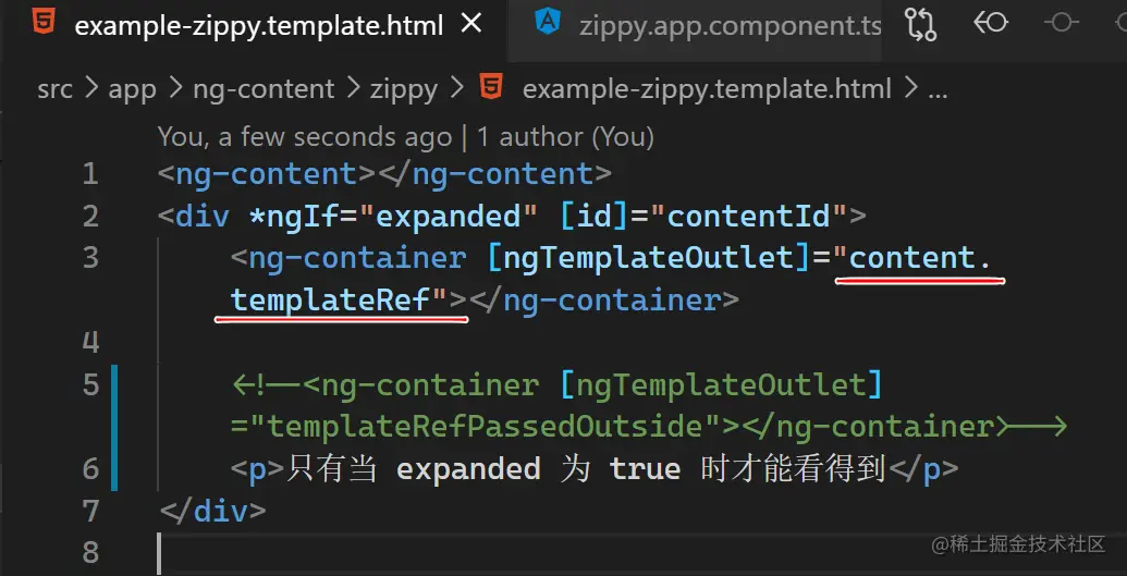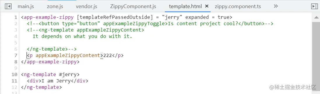通过 @ContentChild conten query 拿到自定义 Directive 实例,进而拿到 Directive 指向的 TemplateRef: