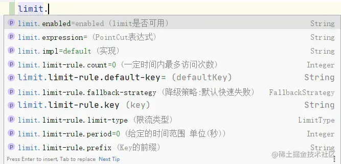 主要配置说明,详见 LimitConfig 限流配置,覆盖原则:有方法级独立配置则使用独立配置,否则使用全局配置,当配置了 limit.expression限流表达式则激活了配置文件接入限流,注解方式失效。