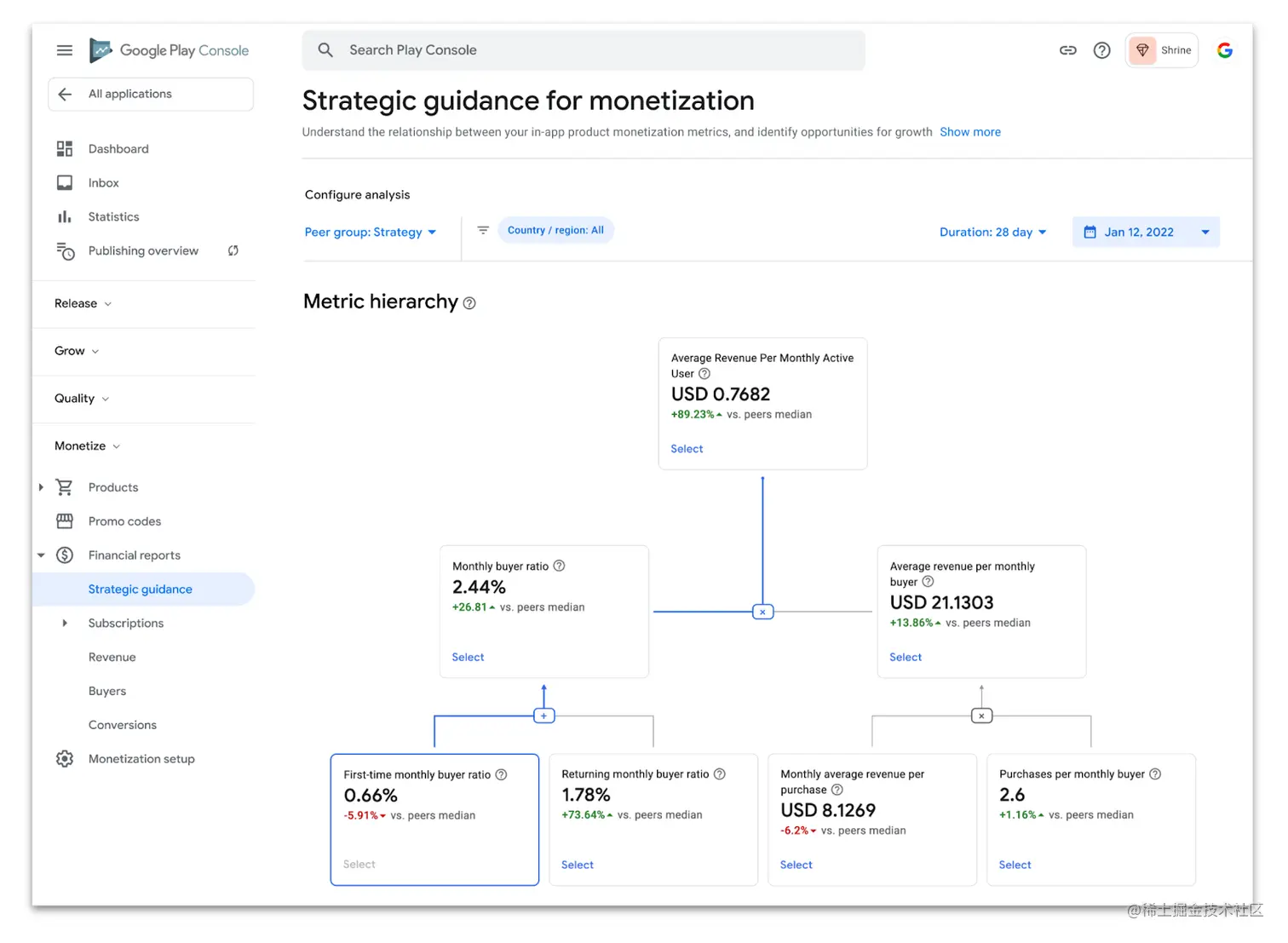 您可以在 Play 管理中心内的财务报告 (Financial reports) 中找到 战略指南 (Strategic guidance)。我们与手机游戏增长方面的专家合作,纳入了主要的获利指标 (包括新指标) 并展示了它们之间的关系,以帮助您轻松评估表现,并与竞品进行比较。您可以在 帮助中心 查看所有指标。