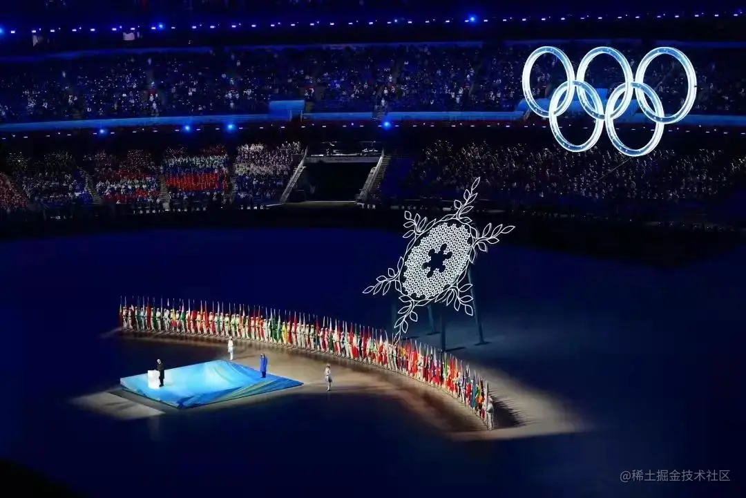 冬奥会开幕式上,来自全世界各地的普通人民走在舞台上,走过后的场地形成一条长长的河流,几百幅中外人民生活的影像陈列其上。