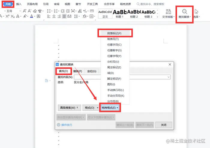 步骤一: 在“开始”栏的“查找替换”中,在“查找”栏点击“特殊格式”选择“段落标记”。