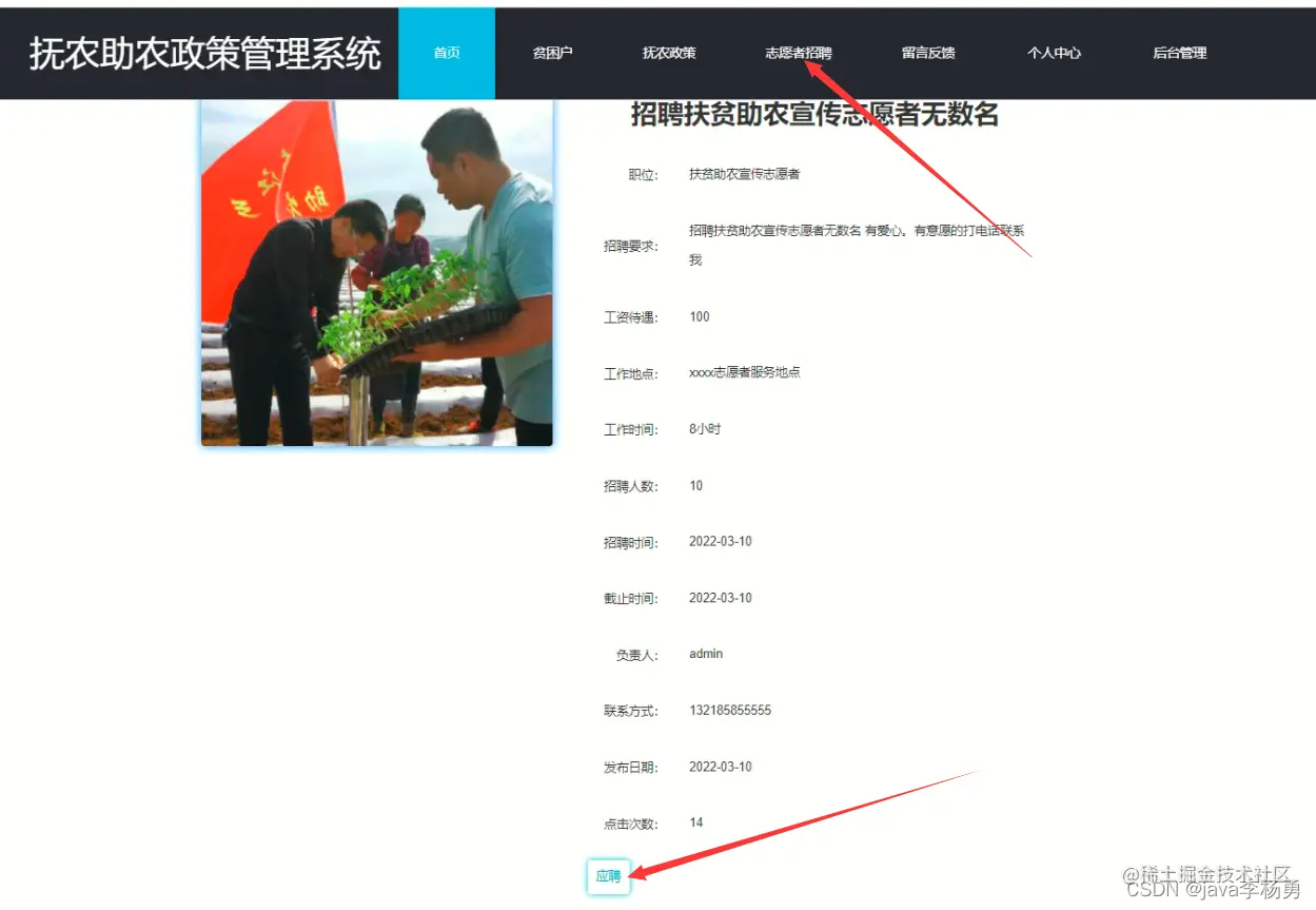 志愿者招聘: 在志愿者招聘管理页面中可以对索引、招聘标题、职位、工资待遇、工作地点、工作时间、招聘人数、招聘时间、截止时间、负责人、联系方式、图片、发布日期等信息进行详情,修改或删除等操作