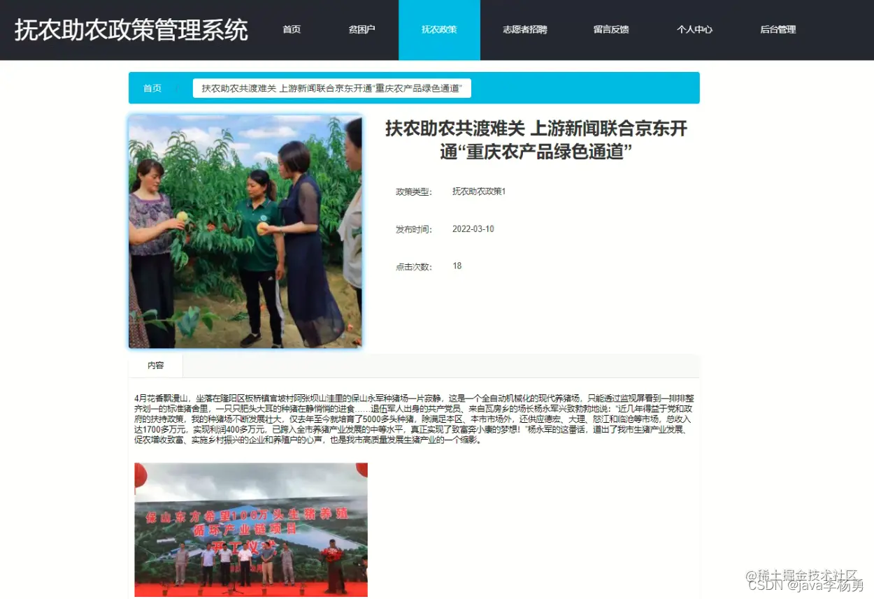 扶农政策信息: 在扶贫政策管理页面中可以对索引、标题、扶贫类型、发布时间、封面等信息进行详情,修改或删除等操作