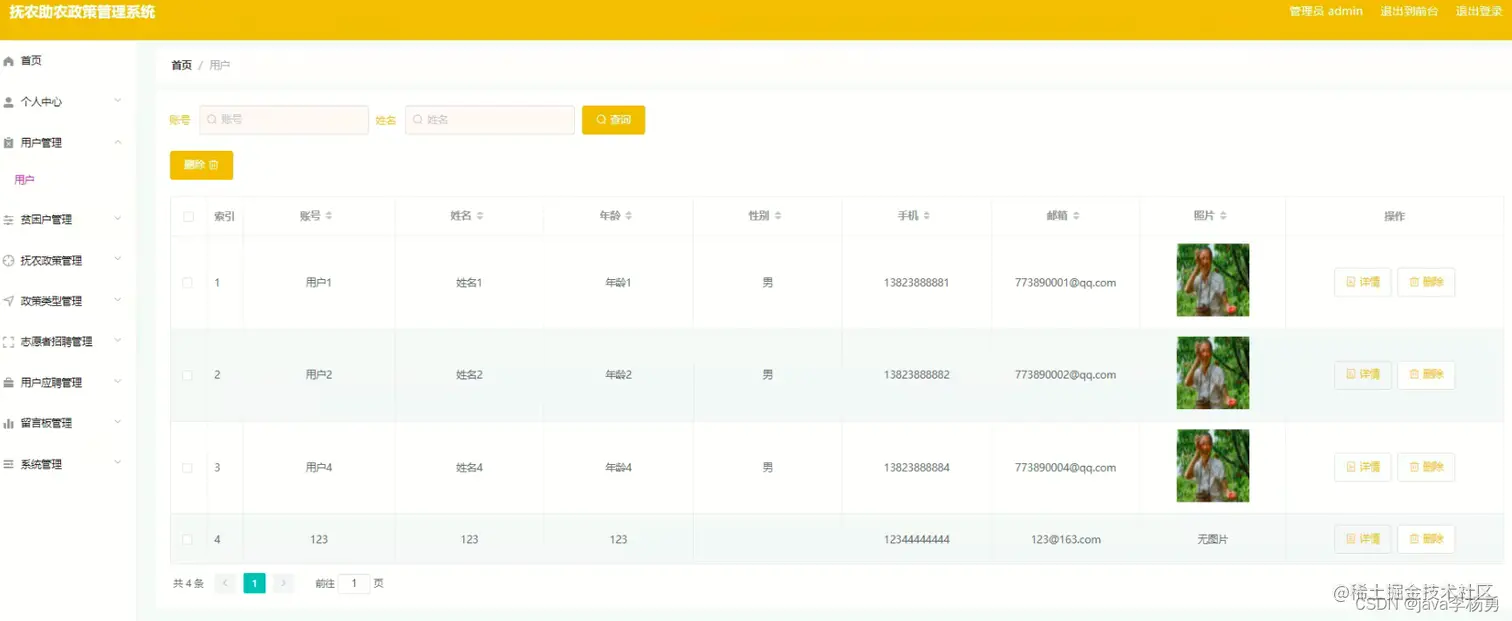 用户管理: 在用户管理页面中可以对索引、账号、姓名、年龄、性别、手机、邮箱、照片等信息进行详情或删除等操作