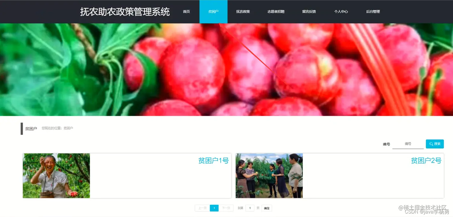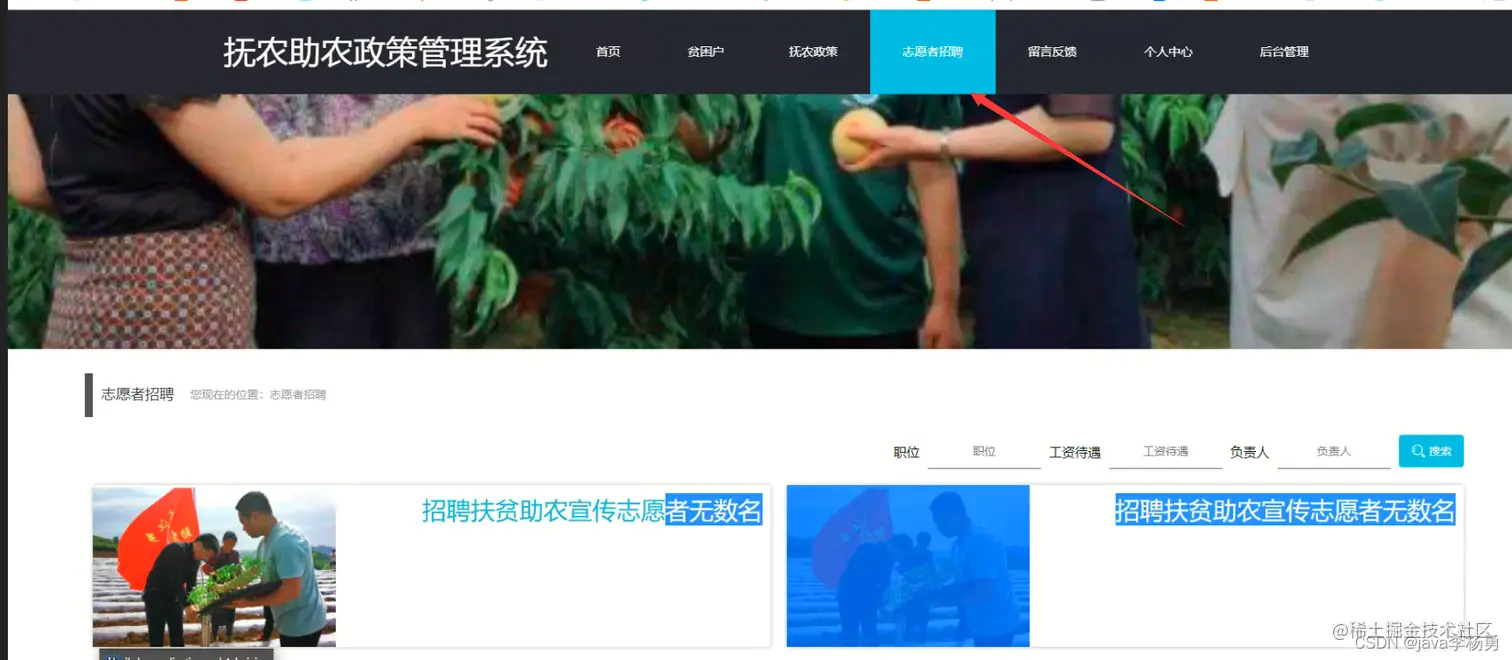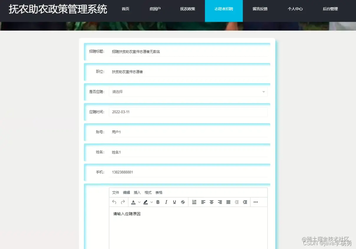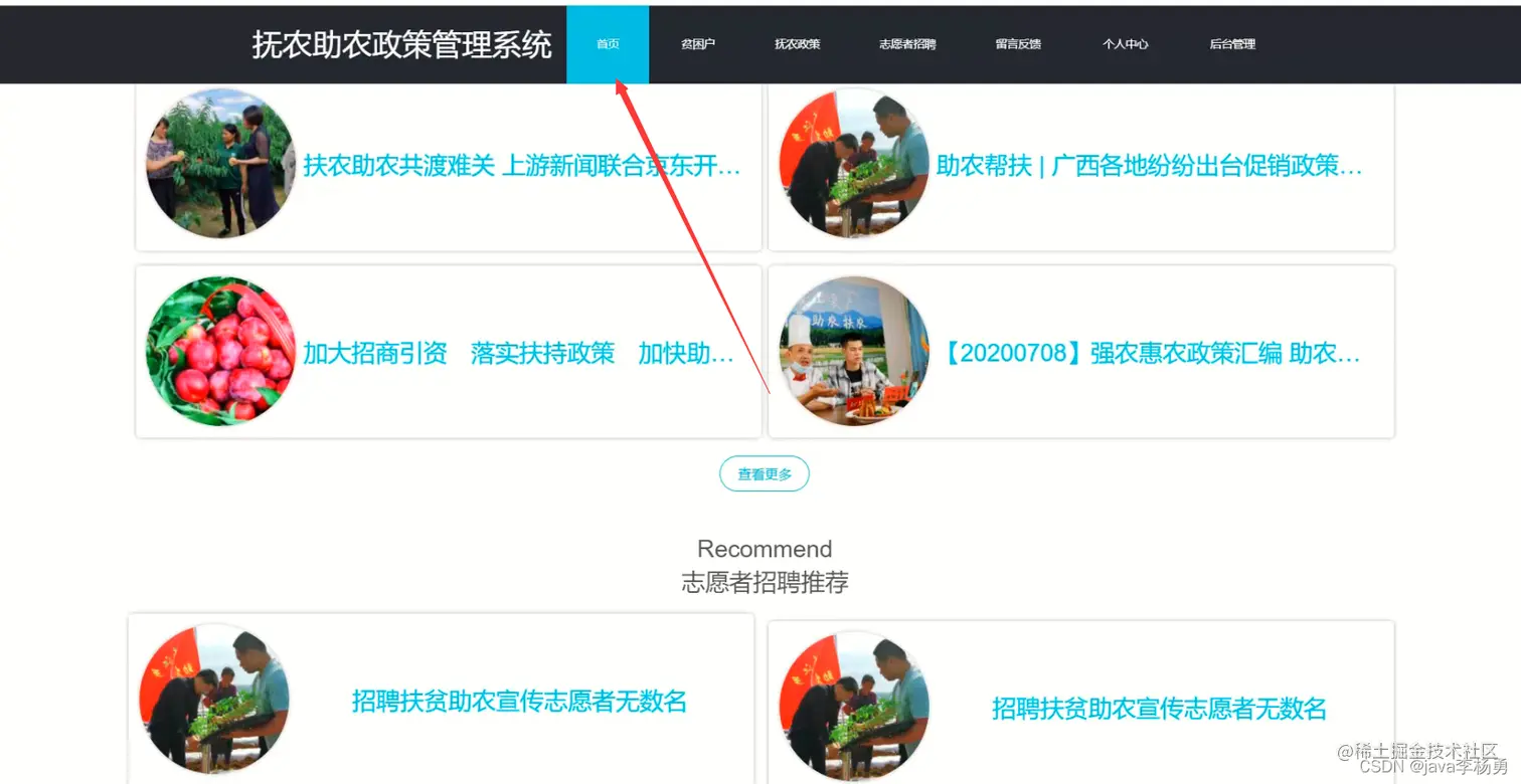 系统首页: 在系统的首页可以查看首页、贫困户、扶贫政策、志愿者招聘、留言反馈、个人中心、后台管理等信息进行详细操作