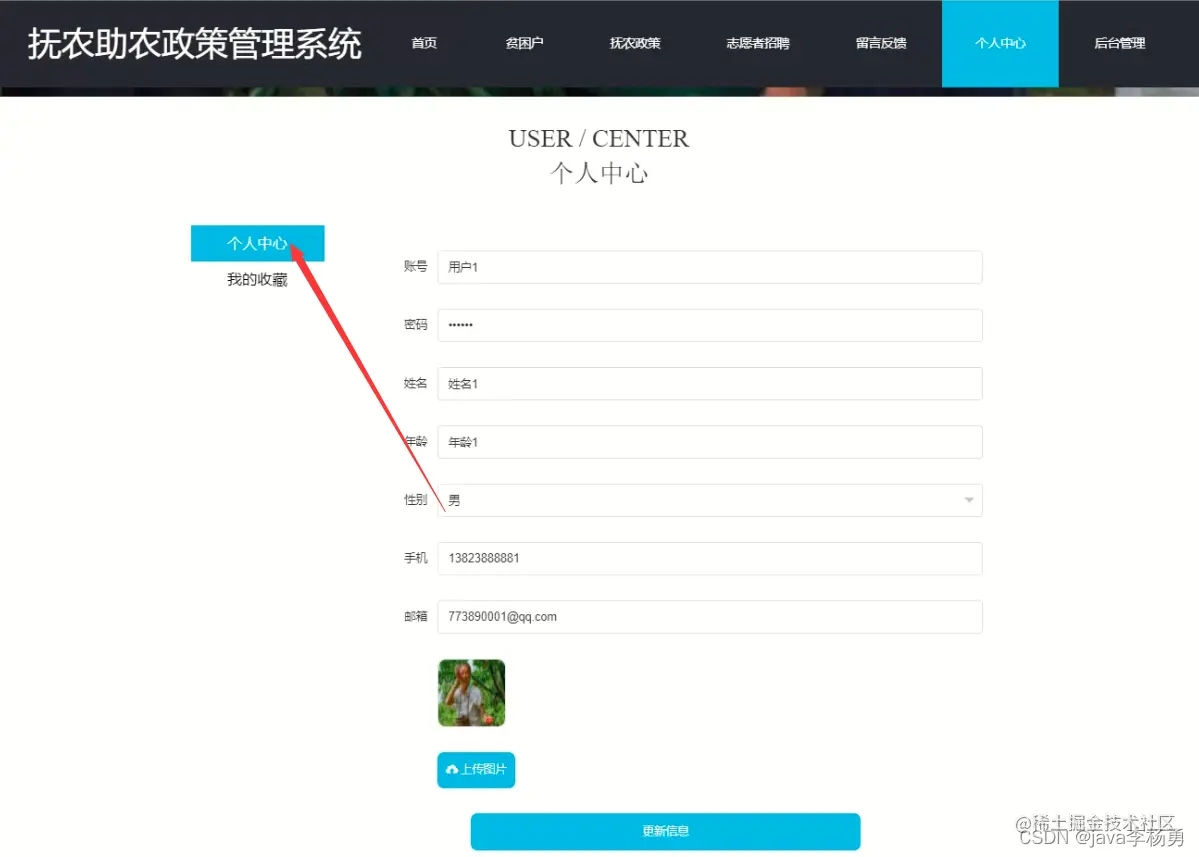 个人中心: 在个人中心页面通过填写账号、密码、姓名、年龄、性别、手机、邮箱、上传图片等信息进行个人信息修改,还可对我的收藏进行详细操作