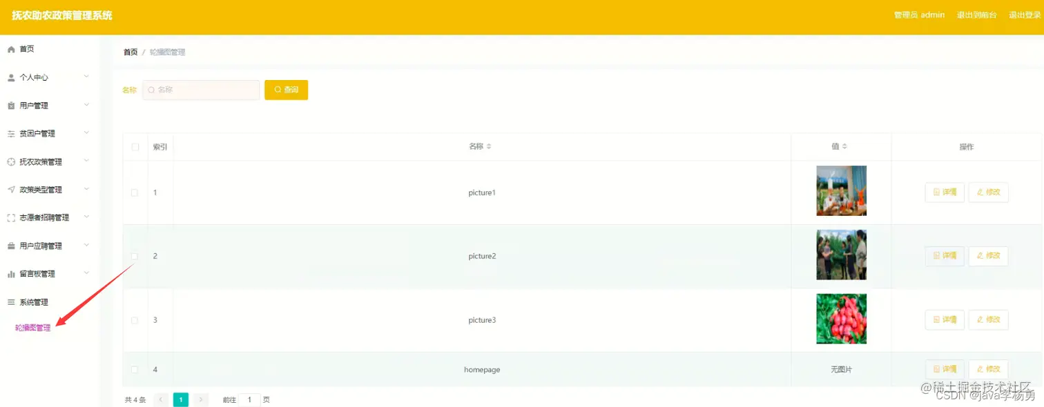 轮播图管理: 在轮播图管理页面中可以对索引、名称、值等信息进行详情,修改等操作