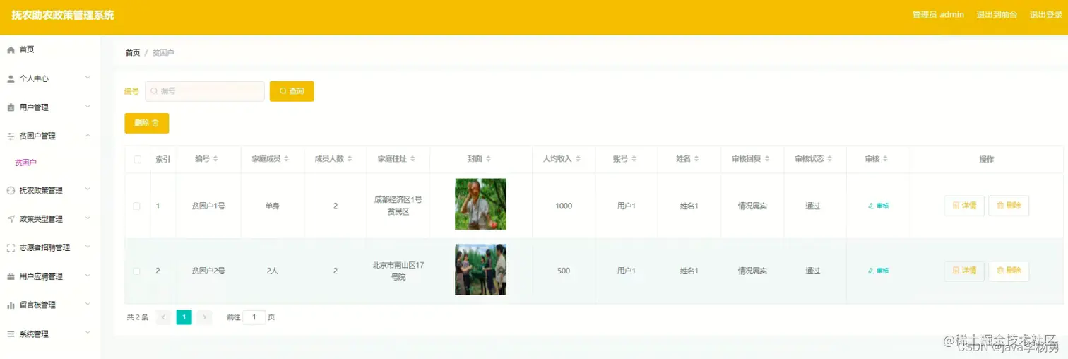 贫困户管理: 在贫困户管理页面中可以对索引、编号、家庭成员、成员人数、家庭住址、封面、人均收入、账号、姓名、审核回复、审核状态、审核等信息进行详情或删除等操作