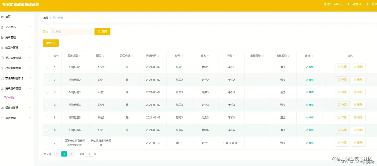 志愿者应聘: 用户应聘管理,在用户应聘管理页面中可以对索引、招聘标题、职位、是否应聘、应聘时间、账号、姓名、手机、审核回复、审核状态、审核等信息进行详情或删除等操作