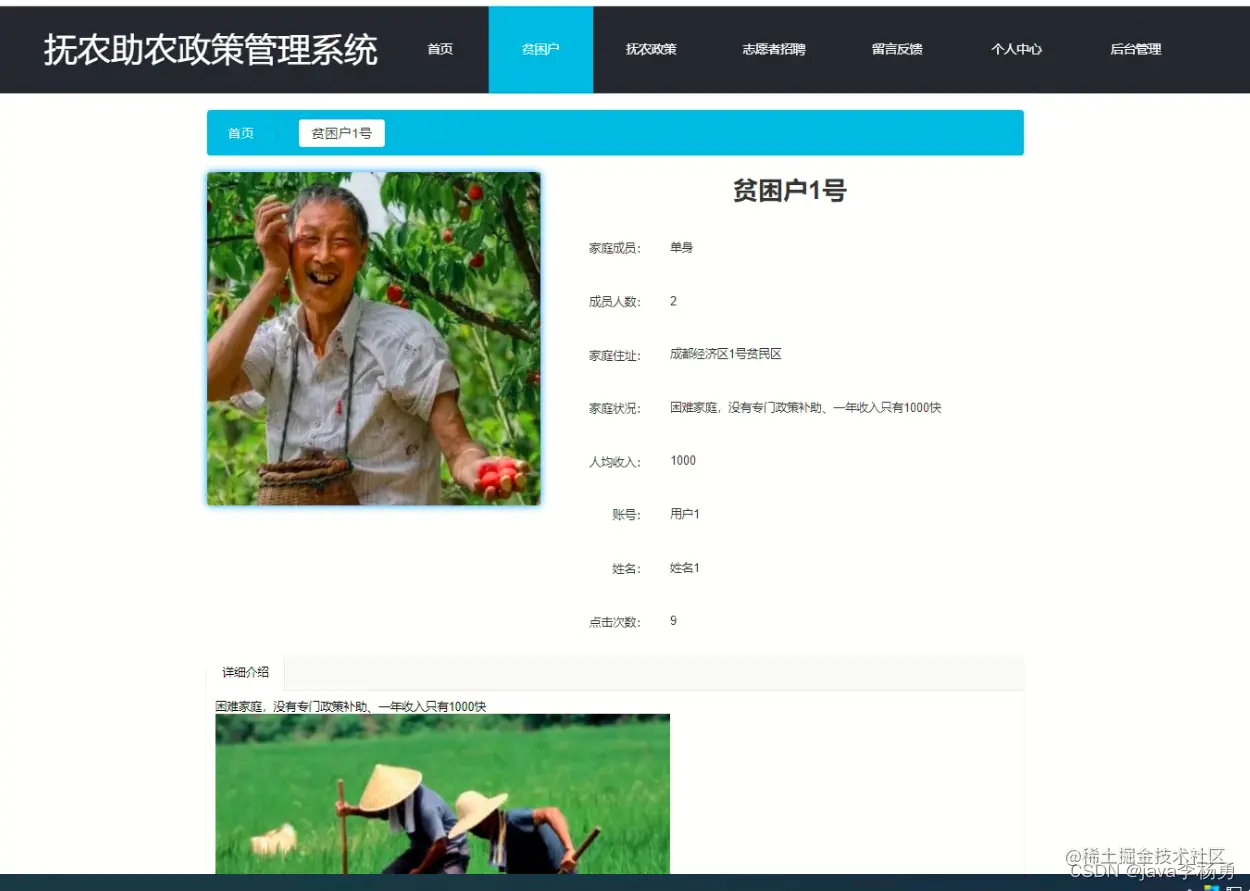 在贫困户页面中可以查看编号、家庭成员、成员人数、家庭住址、家庭状况、封面、人均收入、账号、姓名、详细介绍等信息