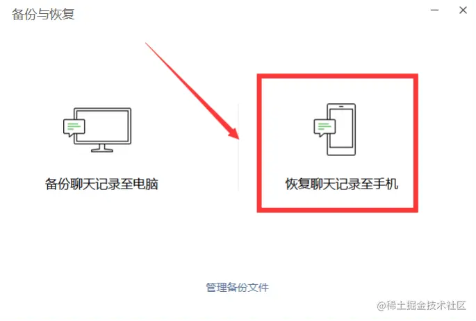步骤二: 在弹出的对话框内有两种模式:“备份聊天记录至电脑”和“恢复聊天记录至手机”,届时需要选择的是“恢复聊天记录至手机”,后续手机上会有操作提示,根据手机微信上的提示操作即可。