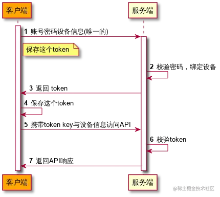 - 客户端得到这个token后,需要进行一个本地保存,每次访问系统API都携带上token与设备信息
