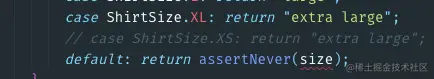never: never 代表代码永远不会执行到这里,常常可以应用在 switch case 的 default 中,防止我们遗漏 case 未处理,比如: