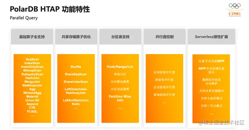 经过持续迭代的研发,目前 PolarDB HTAP 在支持 Parallel Query 上支持的功能特性主要有五大部分: