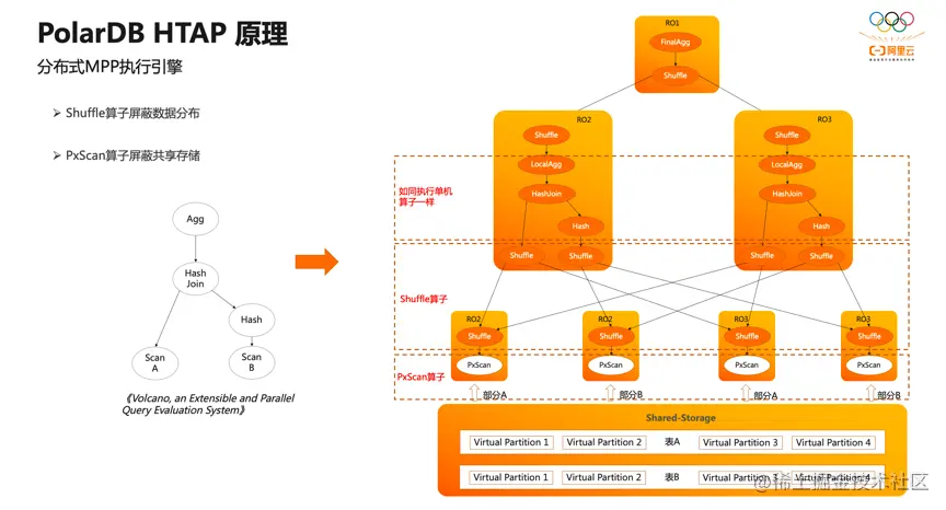 PolarDB HTAP 原理的核心是分布式 MPP 执行引擎,它是典型的火山引擎。 AB 两张表先做 join 再做聚合输出,这也是 PG 单机执行引擎的执行流程。