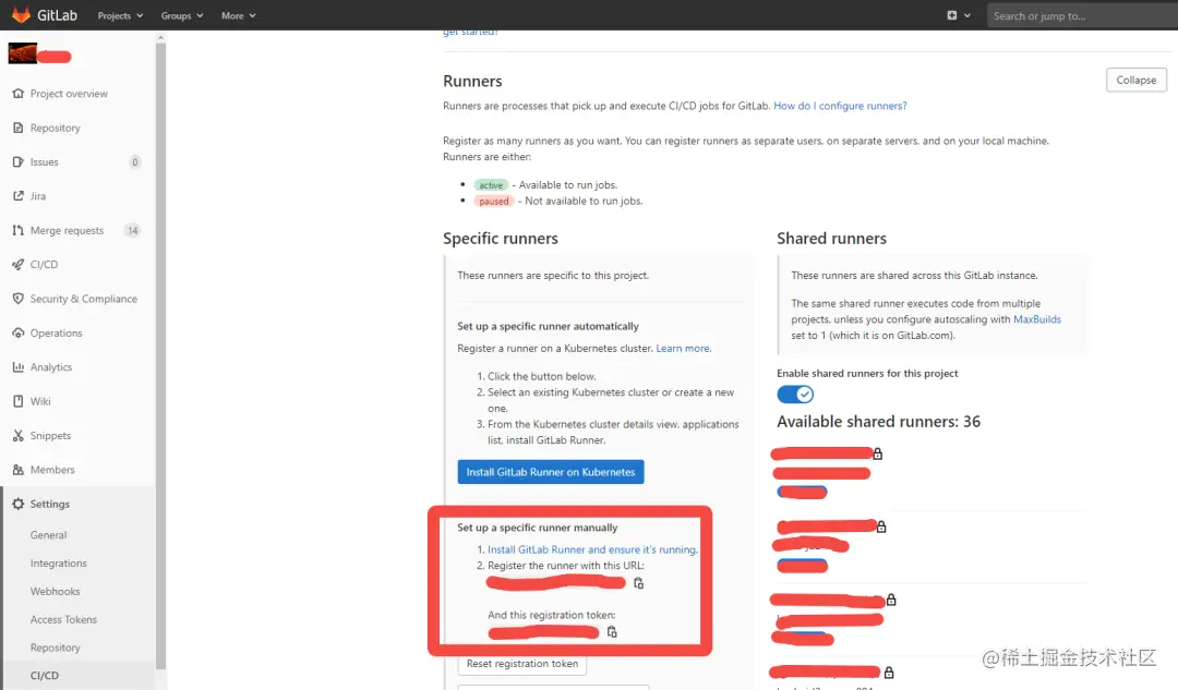 - 展开左边侧边栏最下面 Settings -> CI/CD。点击页面上 Runners 栏右边的 Expand,页面往下滚动一点可看到大概如下,注意红框中的内容。