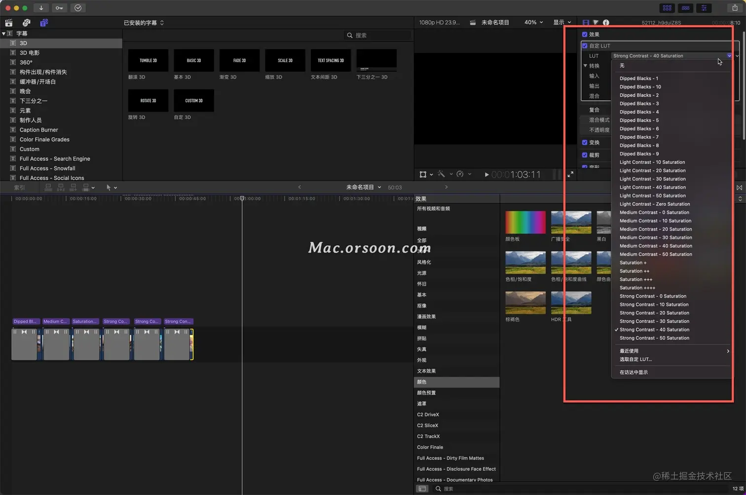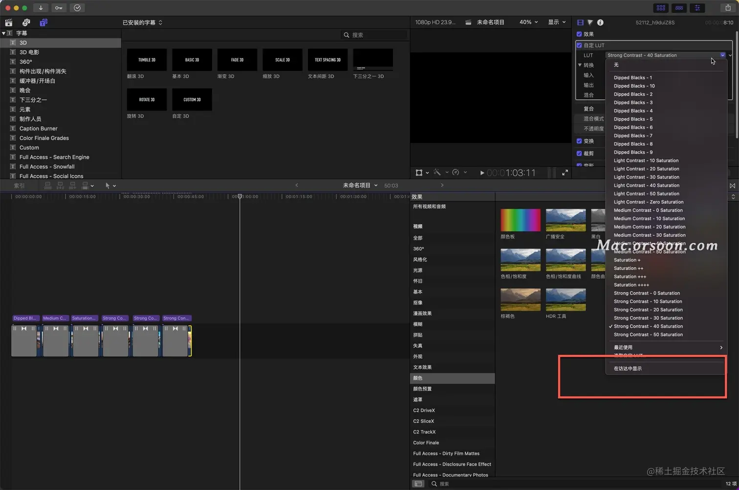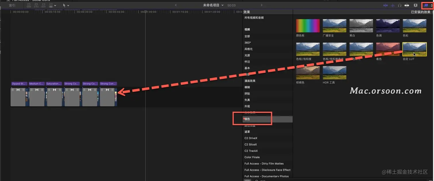 首先打开final cut pro在【效果】中找到【颜色】,找到【自定lut】拖到你需要调色的视频或者图片上