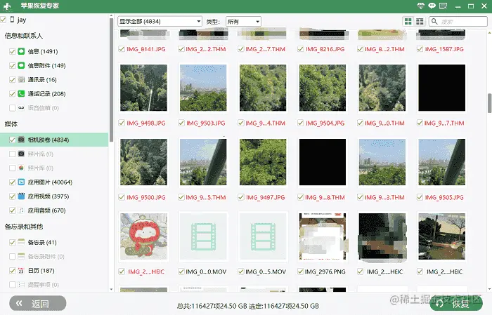 第3步:扫描完成以后,我们就可以从左边往下,找到【相机胶卷】点击即可。往下的过程不仅能看到【相机胶卷】,还能看到一些常用的软件数据都扫描,最后在选择需要的图片后点击【恢复】即可。