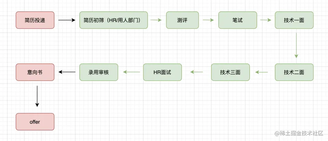 正值金三银四求职季,可能很多小伙伴听说或知道大厂面试流程,就像下面这张图一样清晰,当然有的公司技术面是两面,也可能没有测评和笔试,反正大同小异~