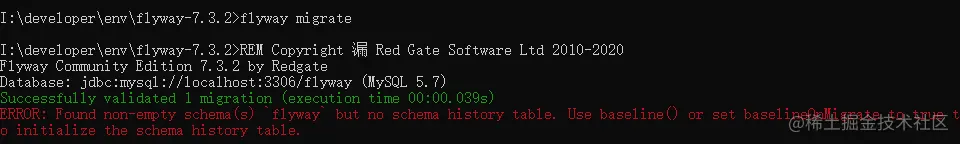 flyway baseline命令,再使用flyway migrate命令,命令行会输出执行成功的信息;
