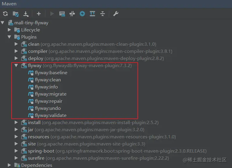 flyway:info命令使用,输出如下内容,此方式与命令行工具使用基本没啥区别。[INFO] --- flyway-maven-plugin:7.3.2:info (default-cli) @ mall-tiny-flyway --- [INFO] Flyway Community Edition 7.3.2 by Redgate [INFO] Database: jdbc:mysql://localhost:3306/flyway (MySQL 5.7) [INFO] Schema version: 1.0.2 [INFO] [INFO] +------------+---------+------------------------+----------+---------------------+----------+ | Category | Version | Description | Type | Installed On | State | +------------+---------+------------------------+----------+---------------------+----------+ | | 1 | << Flyway Baseline >> | BASELINE | 2020-12-24 11:17:35 | Baseline | | Versioned | 1.0.1 | Create ums admin table | SQL | 2020-12-24 11:17:42 | Success | | Versioned | 1.0.2 | Add ums admin | SQL | 2020-12-24 11:33:40 | Success | | Repeatable | | Ums admin view | SQL | 2020-12-24 11:33:40 | Success | +------------+---------+------------------------+----------+---------------------+----------+